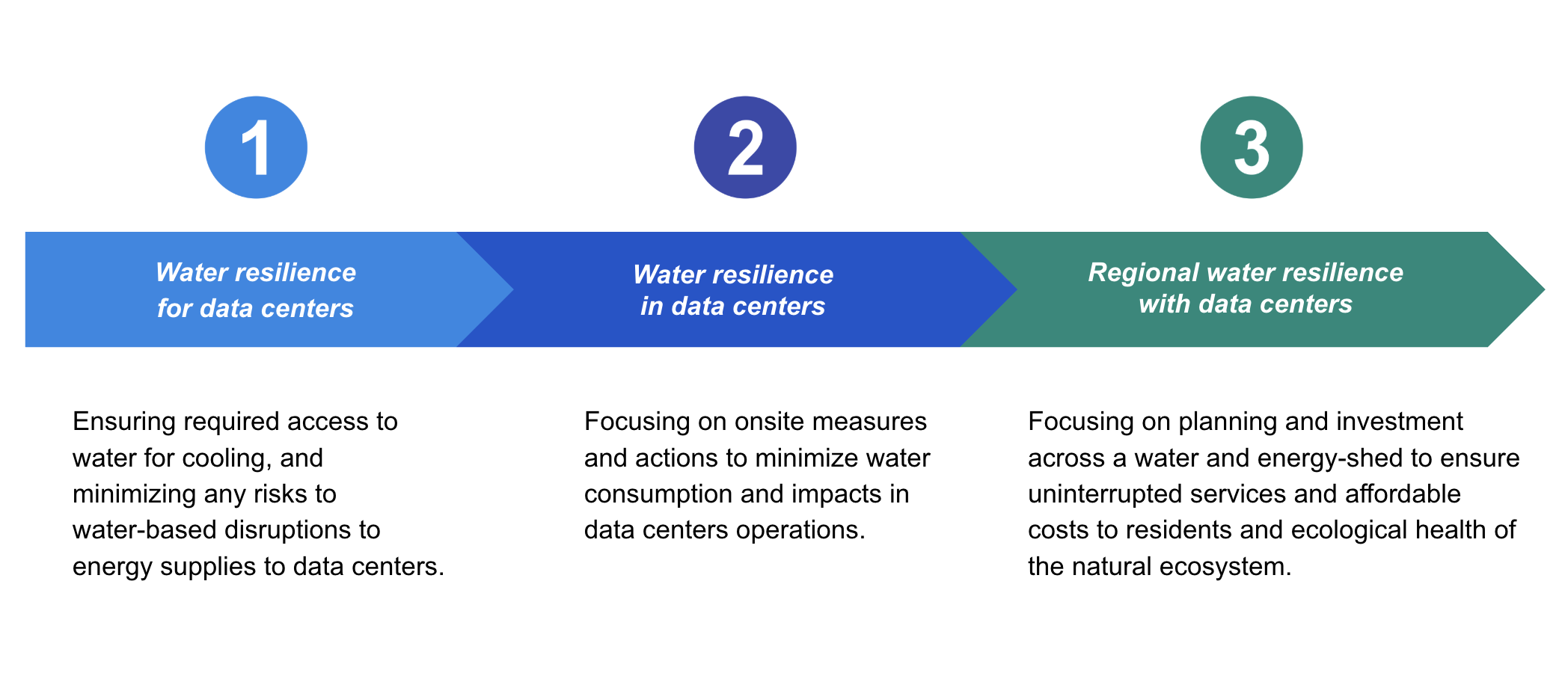 The natural progression for a data center operator is from one to three: understanding the risks, taking direct actions to reduce water risks for operations; engaging in wider basin level action. This is standard stewardship practice but to achieve the best results, the planning process would move from three to one – or at least in parallel. Planning and coordination between stakeholders would focus on moving from regional water resilience strategies that promote measures to support actions for water optimization in data centers to ensure that their water use comes with low risk to other users and the environment.
